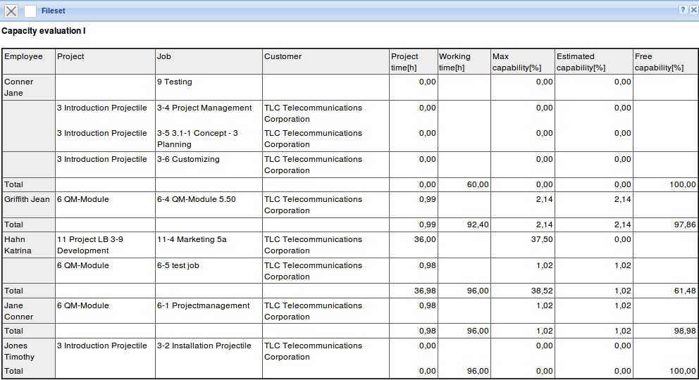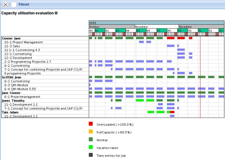 The Capacity Utilisation Evaluation I chart generates an overview of all tasks of the employees, which are employee-related and lists them according to the priorities. That is, in this chart variation, the processing periods of jobs are partially ignored (if the employee has no task for the time period, the next job is chosen). The prioritization of projects is higher than the priority of the individual jobs. Jobs without a project have the lowest priority. In this chart, all already recorded times, holidays and absences of employees are taken into account. Furthermore, it is displayed, when the employee will be finished with the tasks planned for him/her, if all jobs are consistently processed one after the other.