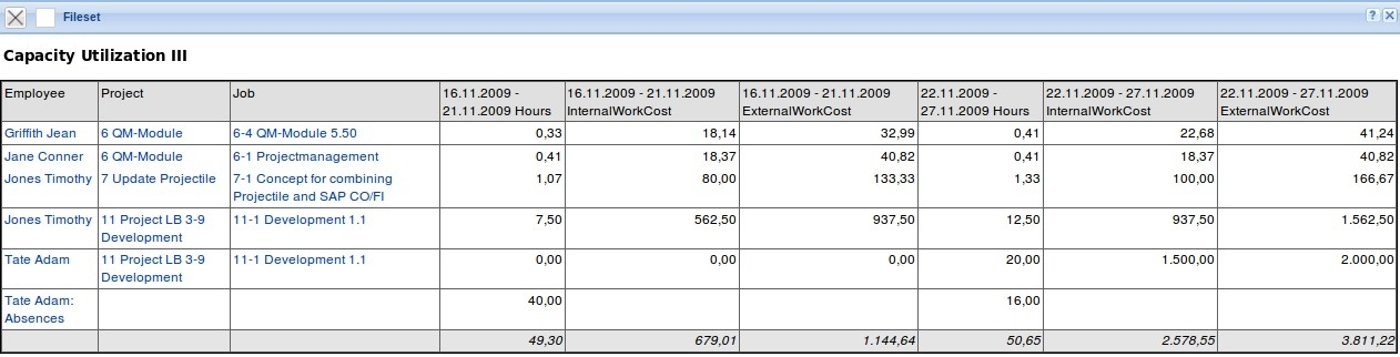 The capacity evaluation chart generates an employee-based overview of all tasks of the employees (in contrast to variant I) for any period of the given time-span. In the tabular display, the planned absolute project times of the employee of the periods are listed. The expenses are multiplied by the system with the respective internal hourly rates and yield the projected cost per period, the planned expenditures with the external hourly rates resulting revenue. The periods can be selected by the user in the tab “Parameters” (default week).