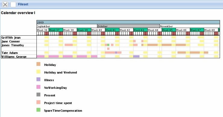 This calendar overview generates an overview of the presence and absence of selected employees of the given time span. This variant displays all absences (vacation, illness, maternity, …).