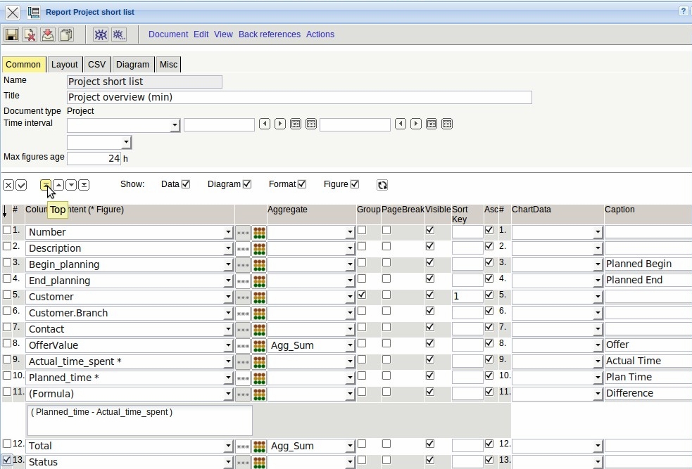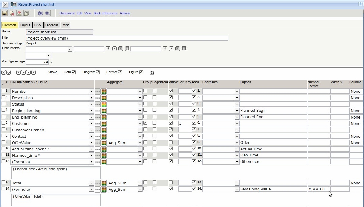The two intermediate results (column 9 and 13) should not be listed in the report, therefore for these values, the check boxes can be set to “visible” is false (not marked).
