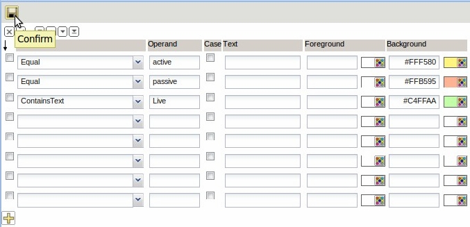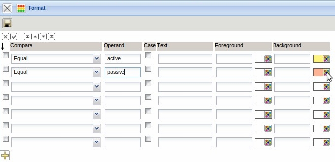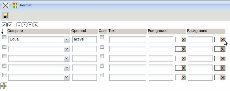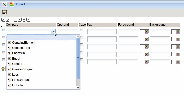 The comparison operators and the operand can be adjusted in the field “Compare” in the format dialog. The values can either be implemented textual (TEXT) or by color (foreground or background color).
