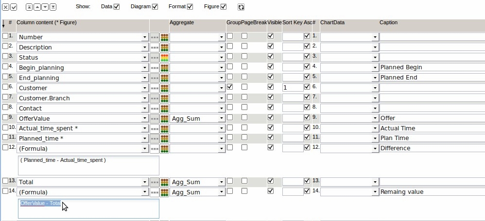 a formula is defined. The new column 14 should be the result (residual value) from the difference of the offer value and the invoice amount and also output the sum.