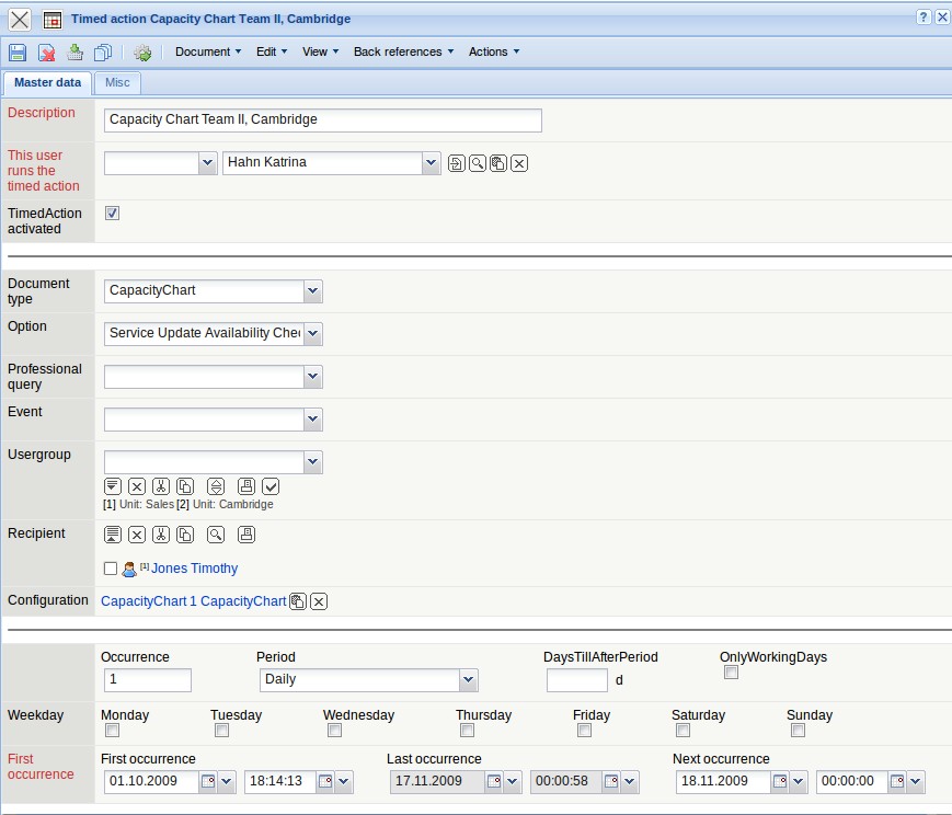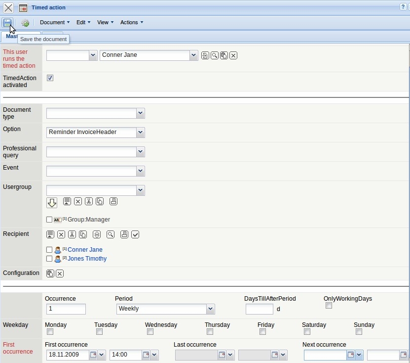 … and also the employees Jane Conner and Timothy Jones). Individual employees as well as groups can be defined as recipients for the timed action.