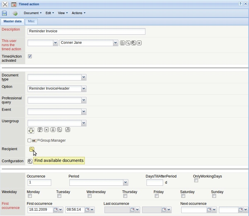 In the example the option reminder invoiceheader is selected. This timed action sends an e-mail when a pre-configured invoice (for example from contracts) is due for invoicing.