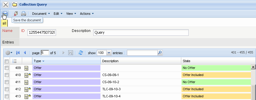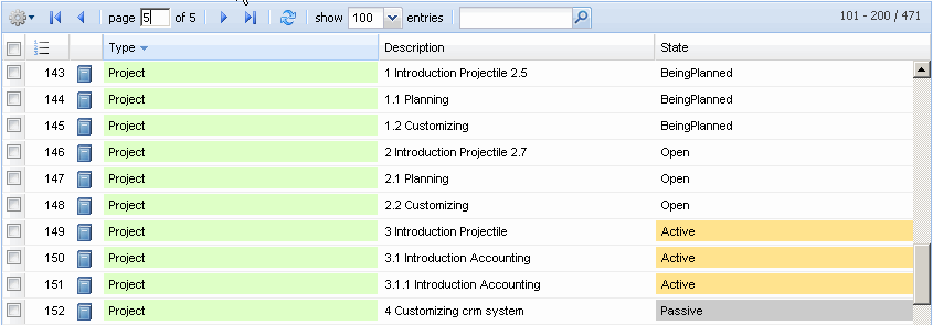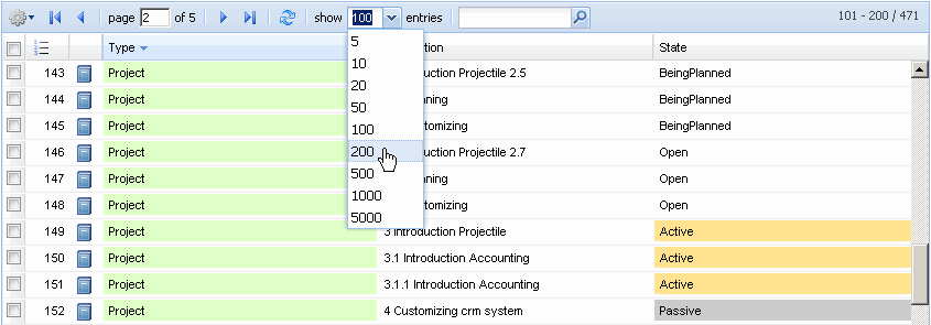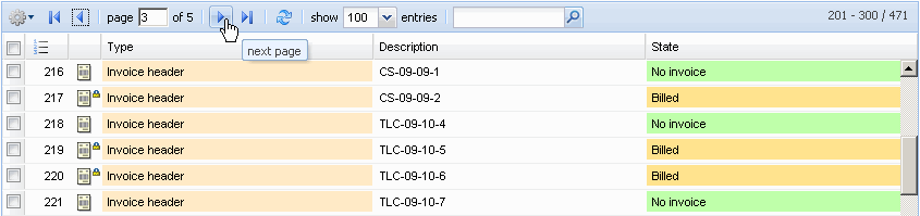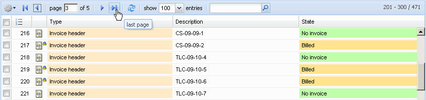 In the result set, using the navigation menu pages can be changed to the previous or next page and/or to the first or last page. Here a result list is displayed with 471 entries, in which the first 100 documents are visible.