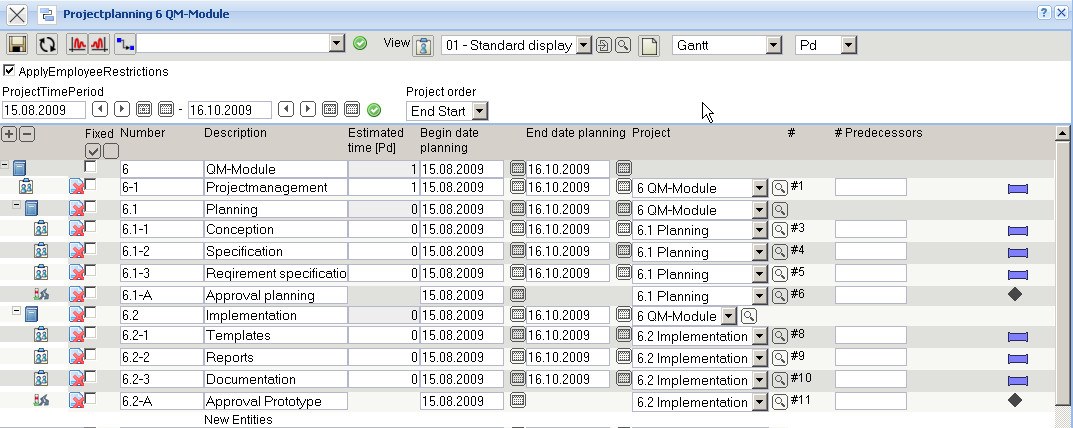 After the definition the project plan is saved and on the right side of the dialogue, functionalities for defining the order relationship is supplied from the system. These columns are used for defining the order relationships between individual jobs and/or milestones.