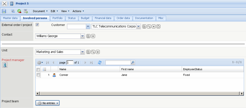 … is displayed. All persons participating in the project are defined here. If the project is external, the appropriate check box is marked and the customer (see also contact form) is selected. The customer's contact person can be selected if a contact should be entered. This function loads all contact persons regarding the customer from the database.