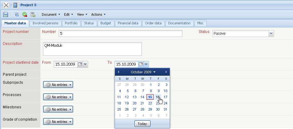 … and the time span is filled. The estimated time span is obligatory for each project because of resource planning. The project end must therefore always be filled!