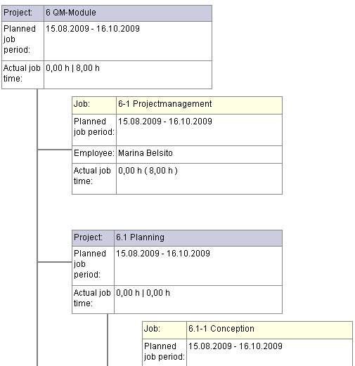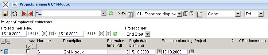 In the following example a job “Project management” with the estimated time/effort of 5 Pd (Person days) is planned for the project “Create QM-Module”.