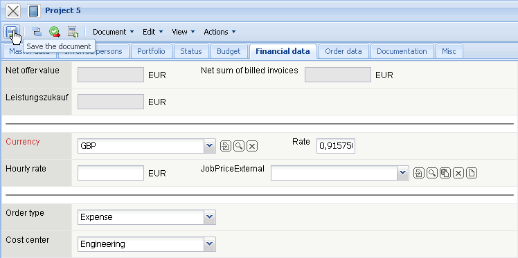 On the “Financial Data” tab, the project currency, the order type and the cost center (if necessary, the benefactor) of the project is defined here.