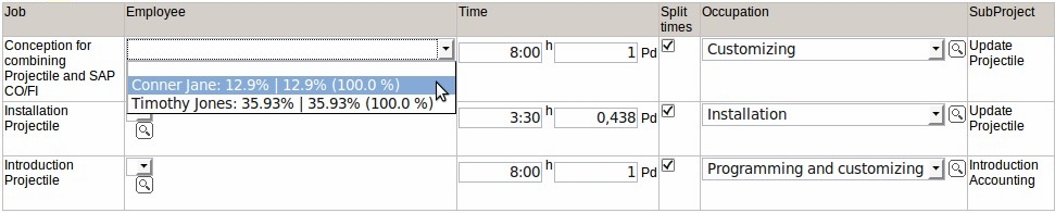 In the dialogue all employees for each job, who are qualified for the task (using the skill management) and the appropriate percentage of the utilisation capacity is displayed. Example: The employee Jane Conner can be planned for the task “Customizing” at 100% (value in the parenthesis) and has a capacity utilisation of approx. 12,5% and 12,5% in the time span of 16.10.2009 to 30.11.2009.