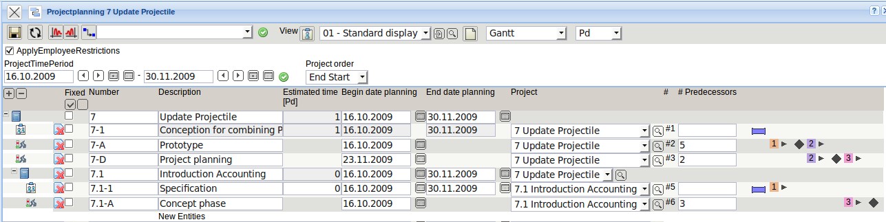 In the example, a parent project and a sub project, various jobs and milestones, as well as order relationships between the tasks have been created. Using the function “Expand Tree”, the complete structure can be displaye:
