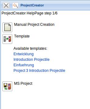 A dialogue is then opened with the selections Manual Project Creation or Template. If one (or more) import interfaces are available, it is then possible to import projects.
