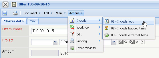 … every job for the project (including every sub-project) will be listed. By marking the appropriate items and by activating the action “Include jobs”, selected jobs will be generated as offer positions in the offer. In the example, first all jobs are selected with the function “Toggle select” …