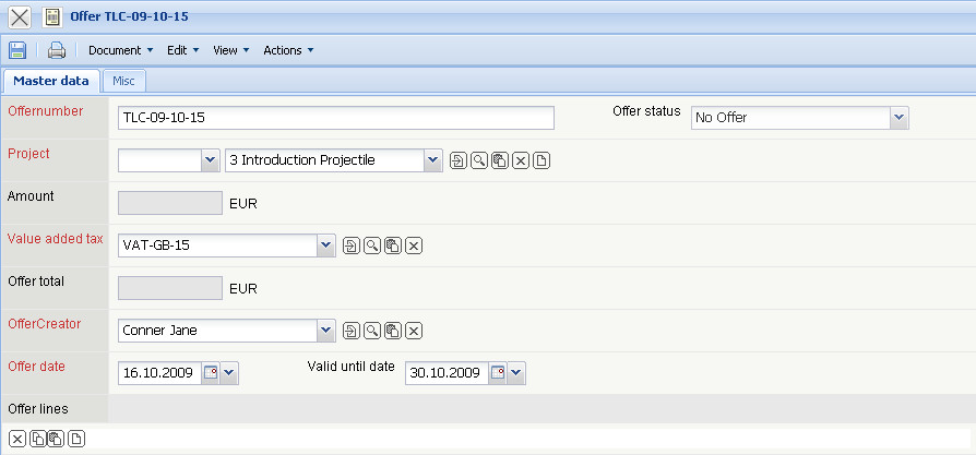 On the budget tab the subtotal of the offer is also transfered into the element offer value. At the same time the system also updates the invoice amount in the invoice.