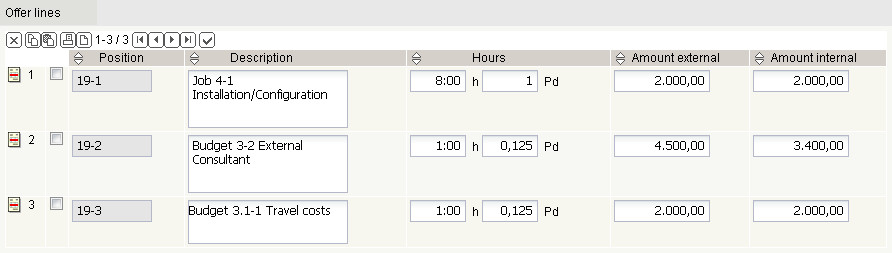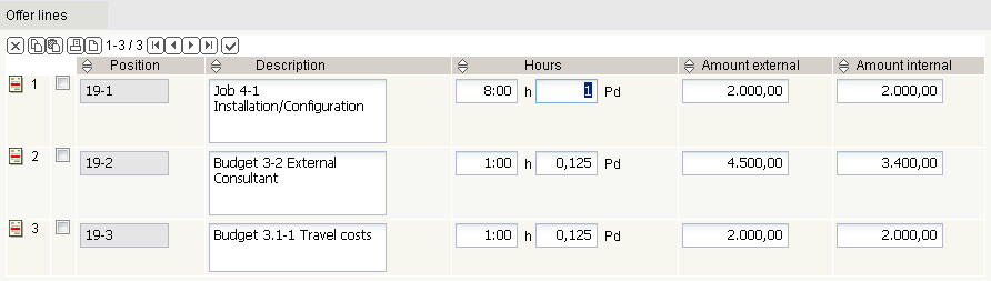 All positions of the offer can be changed or adjusted manually. This happens when you change the amount field or the external amount field. The associated hourly rate of the relevant job is known by the system and the sum will be updated automatically.