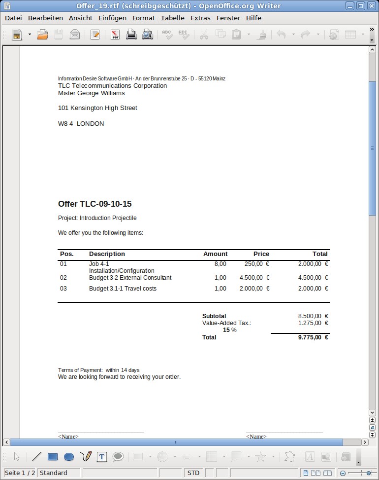 The offer can be shown and printed with a standard word processing program. For this activate the action “print offer (grouping dialogue)”.