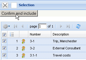 The system lists all the budget items for this project, including the sub-projects. By marking the appropriate items and by activating the action “Include budget items”, selected budget items will be generated as offer positions in the offer. In the example below three budgets are included…