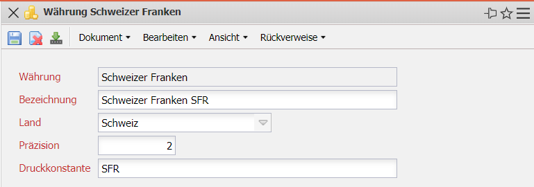Die Maske Währungen verwaltet die Währungen für das gesamte System. Die Währung wird einem Land zugeordnet und enthält Informationen zur Anzahl der Nachkommastellen und der Druckkonstanten der Währung. Die Währungen werden für die Kostenerfassung und die Komponenten des Fakturamoduls benötigt.