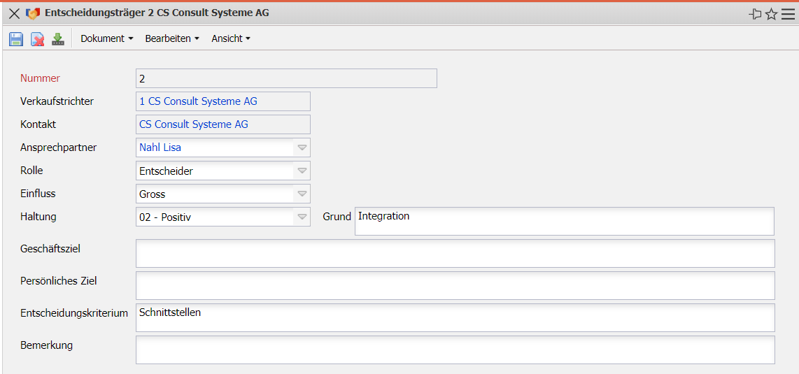 Die Maske Entscheidungsträger verwaltet die am Verkaufstrichter beteiligten Personen (Ansprechpartner) im System. Hier können die Rolle, der Einfluss, die Haltung und weitere Einstellungen eingegeben werden.