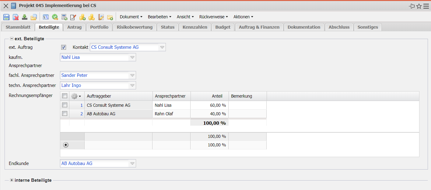 - Projektpartner: Hier können die internen und/oder externen Projektpartner und deren Rolle im Projekt eingegeben werden