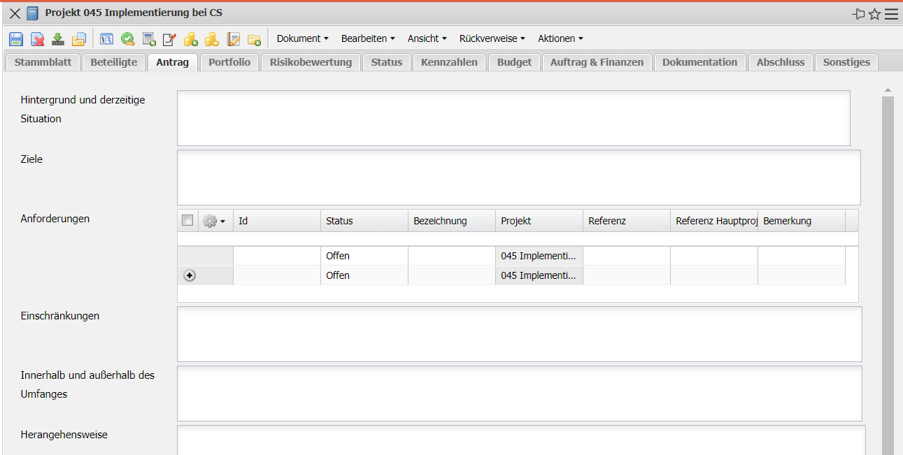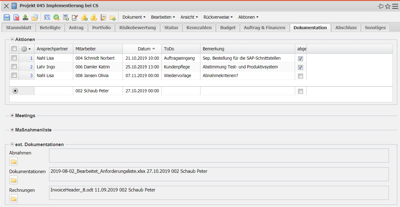 - Aktionen: In diesem Feld können Projektaktionen eingeben oder zugeordnet werden.