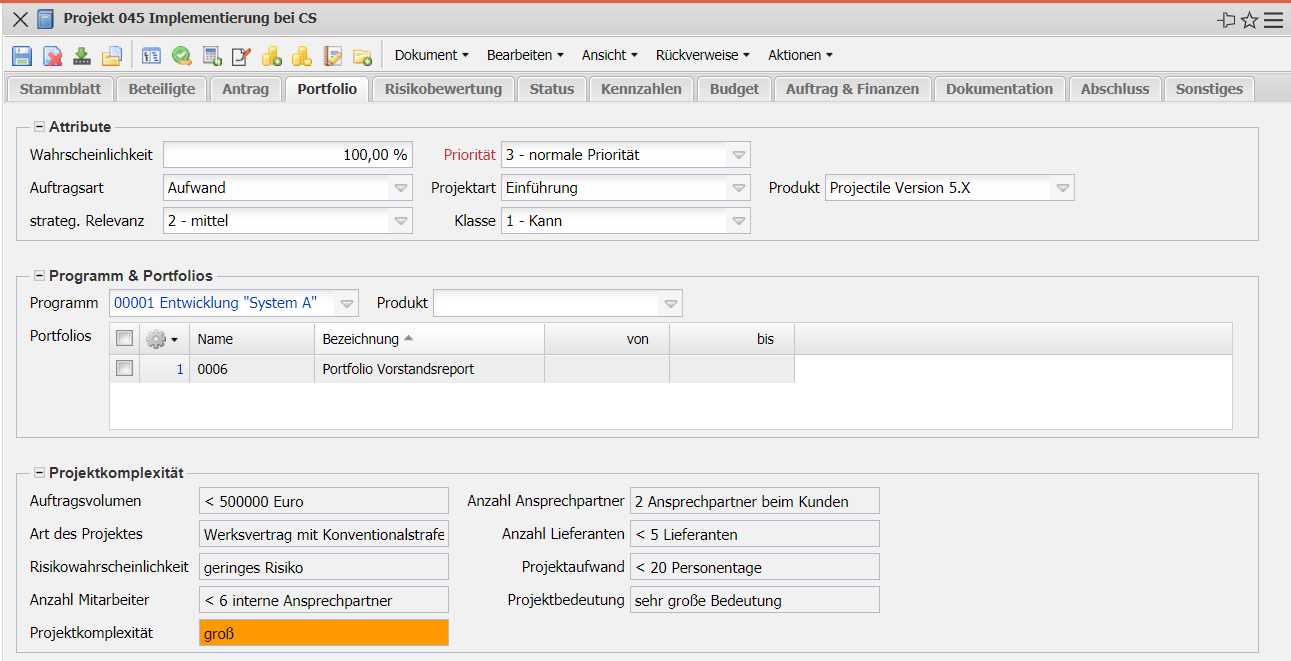 - strateg. Relevanz: Hier kann eine Bewertung des Projektes für die strategischen Relevanz für die Projektlandschaft hinterlegt werden
