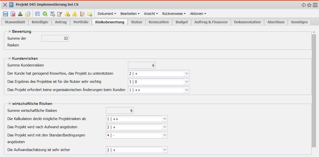 Die dargestellte Risikobewertung ist ein Implementierungsbeispiel und weicht in vielen Version davon ab. Die Risiken werden kategorisiert (hier in Kundenrisiken, wirtschaftliche Risiken, Ressourcenrisiken und Durchführungsrisiken) und beinhalten oft Punktesysteme.
