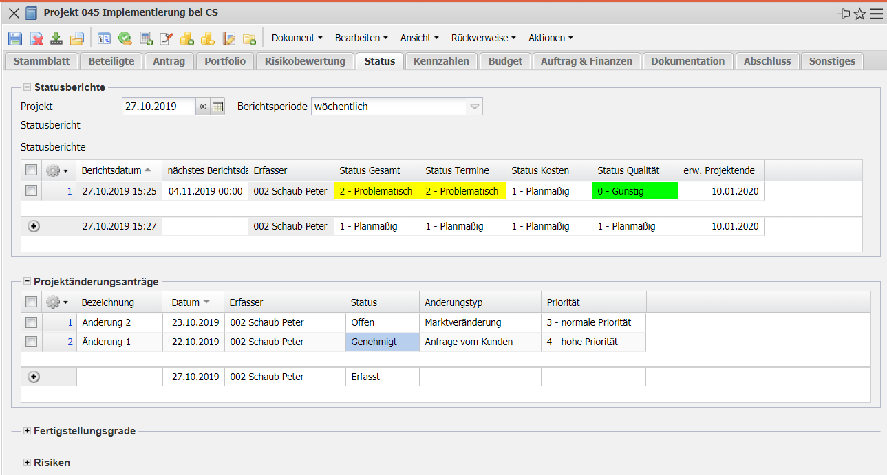 - Projektänderungsanträge: Eine Änderungsanforderung (Change Request) bezeichnet im Änderungsmanagement von Projekten einen formalisierten Wunsch nach Veränderung der Eigenschaften eines bestimmten Produktmerkmals. Der Änderungsantrag beinhaltet oft die Beteiligten/Verantwortlichen, die Priorität, eine Kategorisierung und die quantitaiven Auswirkungen (Aufwand, Kosten, Umsatz, …) auf das Projekt