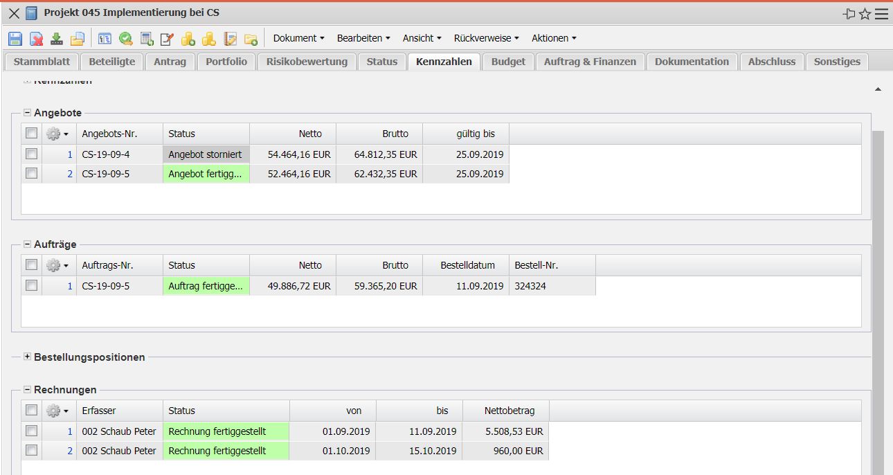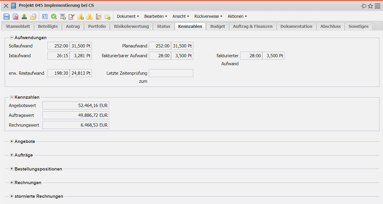 - Rechnungswert: Hier ist die Summe aller Rechnungswerte des Projektes hinterlegt (netto).