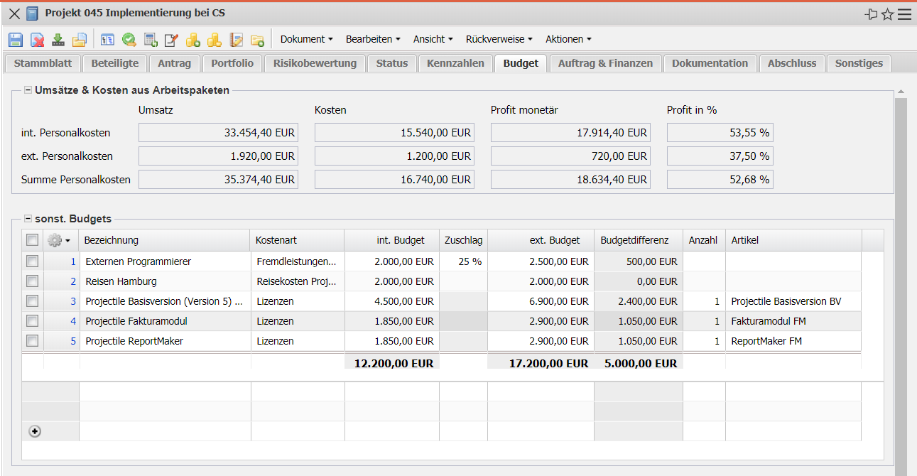 Auf dem Reiter „Budget“ befinden sich im oberen Rahmen die Planumsätze, Plankosten und der geplante Profit (absolut und in Prozent). Diese Werte berechnen sich auf Basis der Arbeitspakete. Im nächsten Rahmen können sonstige Budgets verwaltet werden, bspw. für Reisekosten, externe Berater und Lizenzgebühren. Im unteren Rahmen befinden sich die Zuschläge. In den meisten Versionen können bis zu drei Zuschläge (absolut oder prozentual) eingeben werden. In der Standardversion sind das Zuschläge für Festpreisprojekte, Risiken (meist in der Aufwandsschätzung) und Verhandlungszuschläge.