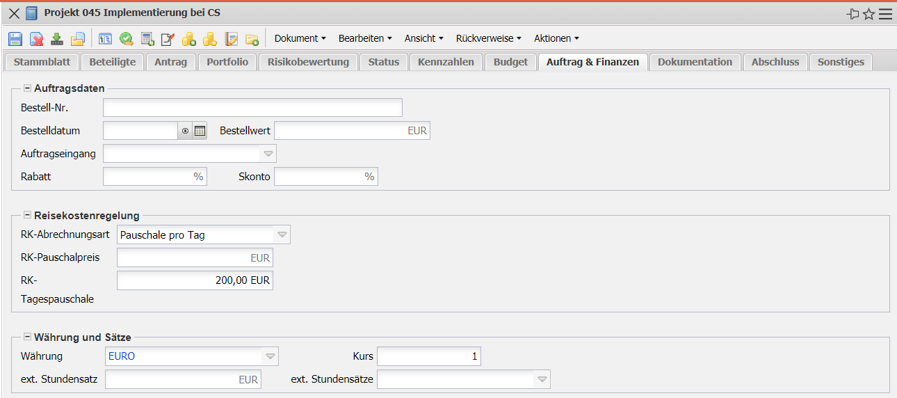 In der Maske werden alle relevanten Informationen über das Projekt und seine Beziehung zum Oberprojekt (seine hierarchische Stellung also in der Projektstruktur), die Aktivität, Kunden, Währung, Projektstundensatz, Projektleiter, die nötigen Qualifikationen, die Zuordnung zum Projektteam, Kostenstelle und Anlagedaten definiert. Darüber hinaus werden hier die Planwerte für Projektbeginn und -ende, das Projektbudget, die Projektkosten und die Projektdauer dem Projektverantwortlichen angezeigt.