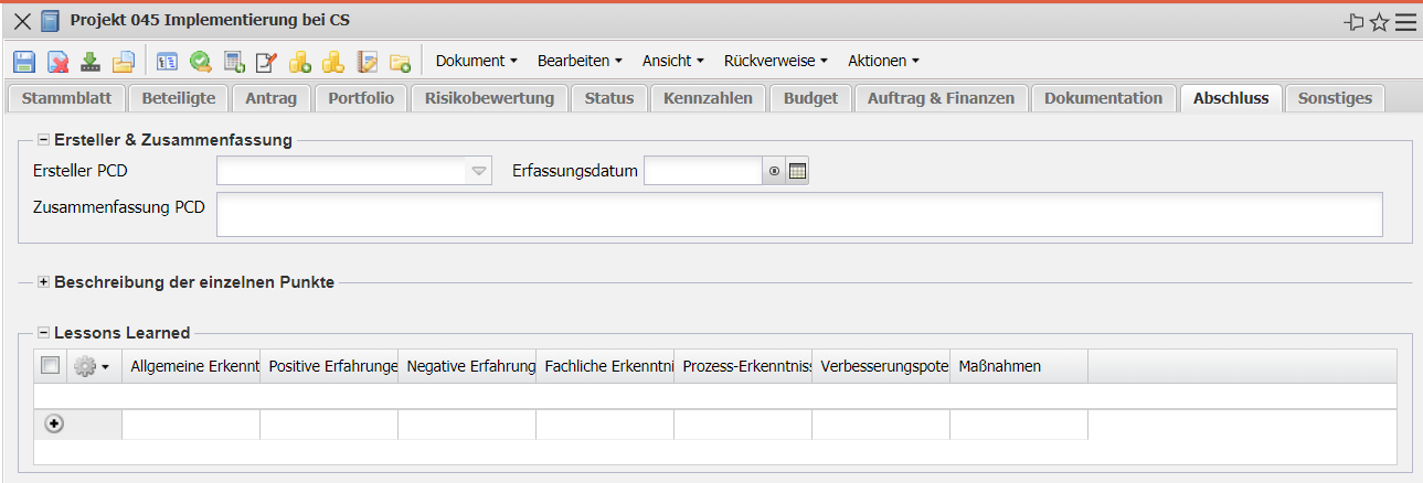- Ersteller & Zusammenfassung: Hier kann eine Zusammenfassung des Abschlussberichtes (Proejct Closing Document - PCD) hinterlegt werden.