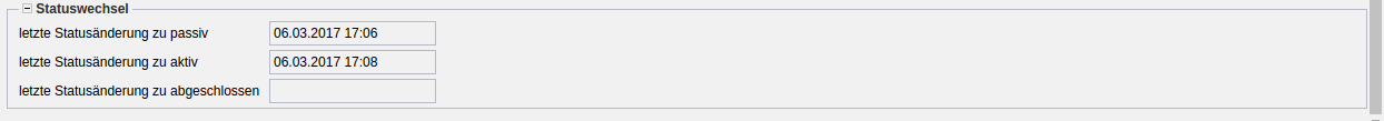 - letzte Statusänderung zu passiv, aktiv oder abgeschlossen: Hier werden die wichtigsten Statusänderungen aufgelistet (passiv - erfasst, aktiv/Vorleistung, abgeschlossen/abgebrochen). Die vollständige Historie aller Statuswechsel befindet sich in im Menüpunkt „Ansicht - Ereignis-Log anzeigen“.