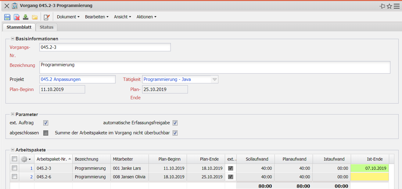 • abgeschlossen: Dieses Kennzeichen wird automatisch vom System gesetzt, wenn alle zugeordneten Arbeitspakete abgeschlossen sind.