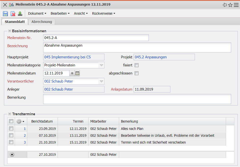 - Trendtermine: Dieses Feld ermöglicht das Anlegen von Trendterminen zu den Meilensteinen.