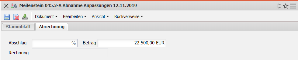 - Abschlag und Betrag (Bestandteil Fakturamodul): Diese zwei Felder beziehen sich auf die Rechnungsstellung nach Meilensteinen. Wenn ein Meilenstein über das Kennzeichen abgeschlossen wird, erzeugt das System eine Abschlagsrechnung mit dem Abschlag oder den Betrag (siehe auch Vertrag und Rechnung).
