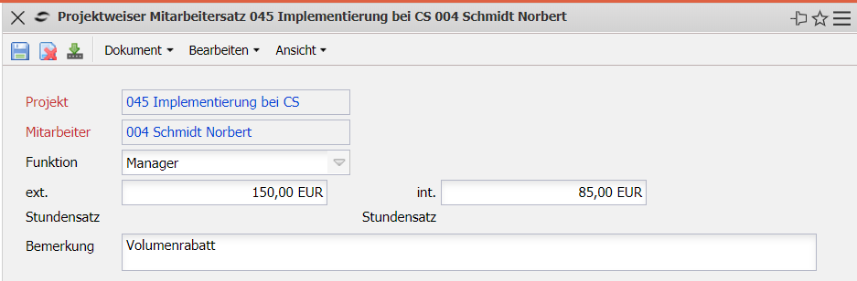 • Externer Stundensatz: Hier wird der Berechnungssatz des Mitarbeiters festgelegt. Dies wird dann dem Kunden für dieses Projekt in Rechnung gestellt.