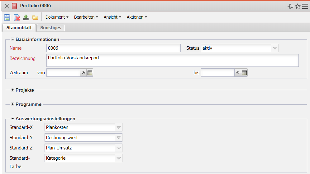 Basis des Projektportfolio-Managements sind die Zusammenstellungen von Projekten. In dieser Maske können die Projekte zusammengestellt werden und die Achsen für die Auswertungen vordefiniert werden.