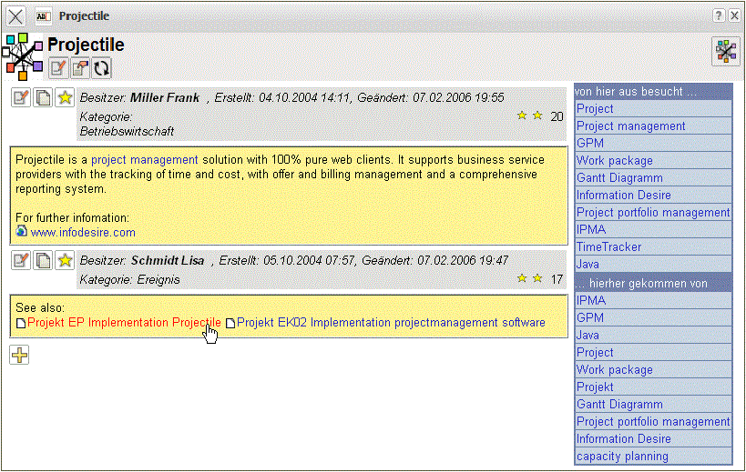 Die Begriffe auf der rechten Seite (Projekt, Projektportfolio-Management, Projektmanagement, Information Desire) sind sogenannte SoftLinks und kennzeichnen Informationen, die vom aktuellen Eintrag heraus aufgerufen worden sind. Wie im menschlichen Gehirn werden häufig benutzte Verknüpfungen stärker hervorgehoben. Das heißt, diese Verknüpfungen erscheinen weiter oben in der Linkliste und sind so leichter zu finden.