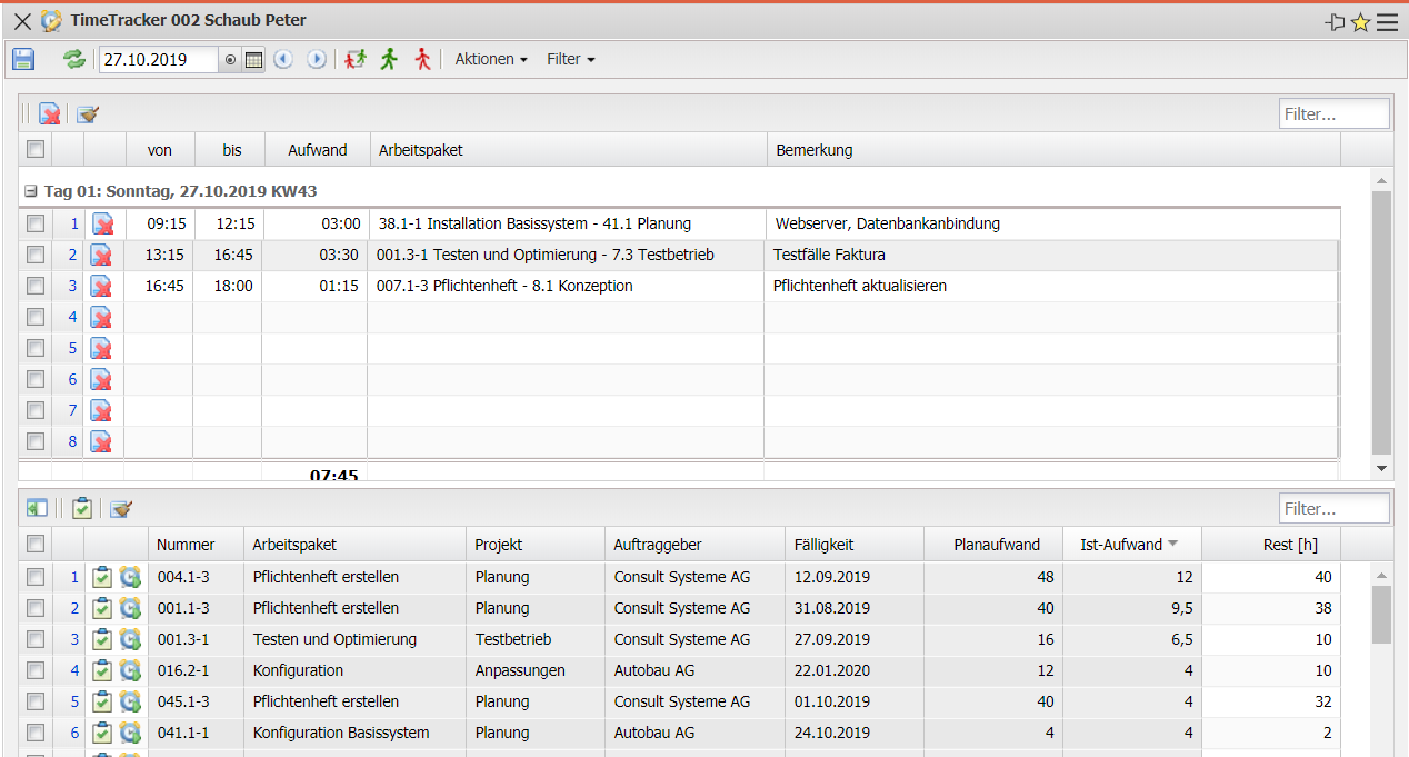 Der untere Bereich des TimeTrackers dient der Zeiterfassung von Arbeitspaketzeiten mit einer Stoppuhrfunktionalität und kann als ToDo-Liste verwendet werden (Abbildung oben ist eine Beispielkonfiguration):