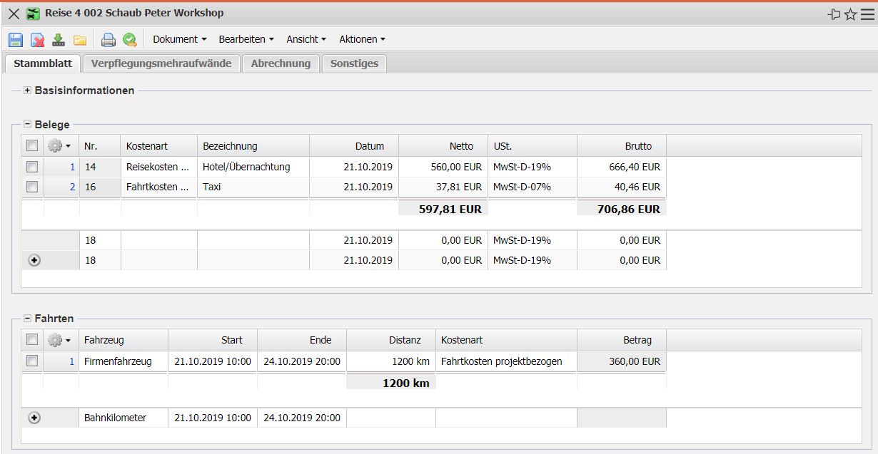 • Belege: Dieses Element beinhaltet eine Auflistung aller zugeordneten Belege zur Reise (siehe auch Maske Beleg).