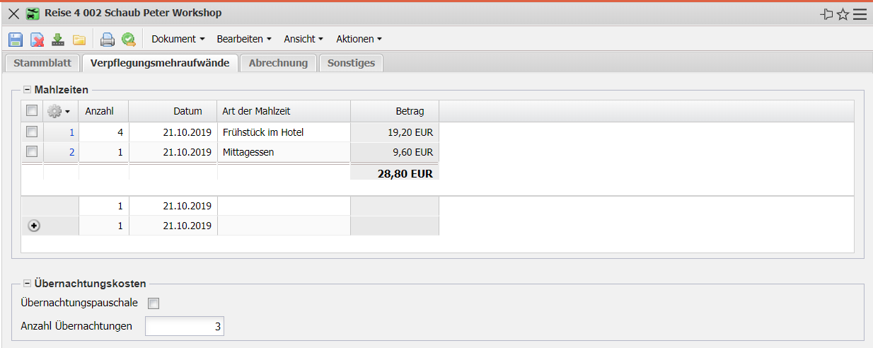 • Mahlzeiten: Dieses Element beinhaltet eine Auflistung aller zugeordneten Mahlzeiten zur Reise. Diese Mahlzeiten werden verwendet, wenn in den Hotelkosten oder bei Geschäftsessen Mahlzeiten enthalten sind, die als geldwerter Vorteil abgezogen werden sollen (siehe auch Konfiguration)..