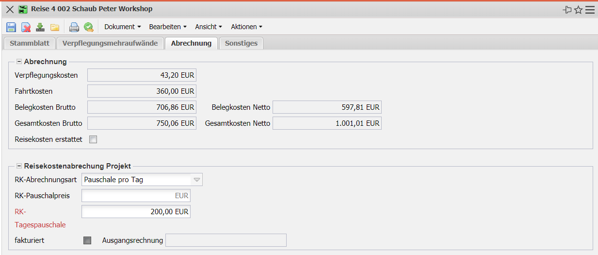 Die Maske Reise ermöglicht die Erfassung von projektbezogenen Reisen, die ein Mitarbeiter im Rahmen eines bestimmten Projektes unternommen hat. Aus der Reisedauer (Differenz aus Reisebeginn und Reiseende) und der zugrunde gelegten Tagegeld- und Übernachtungspauschale, errechnen sich die Tagesgeldpauschalen der Mitarbeiter. Darüber hinaus können die erfassten Beträge aus den Belegen und den Fahrten einer Reise zugeordnet werden. Auch die Mahlzeitenstellung bei Übernachtungen im Hotel wird berücksichtigt.