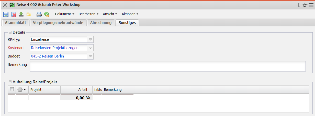 • Budget: Im Feld Budget kann den Reisekosten ein Budget aus den zugeordneten Projekt zugeordnet werden.