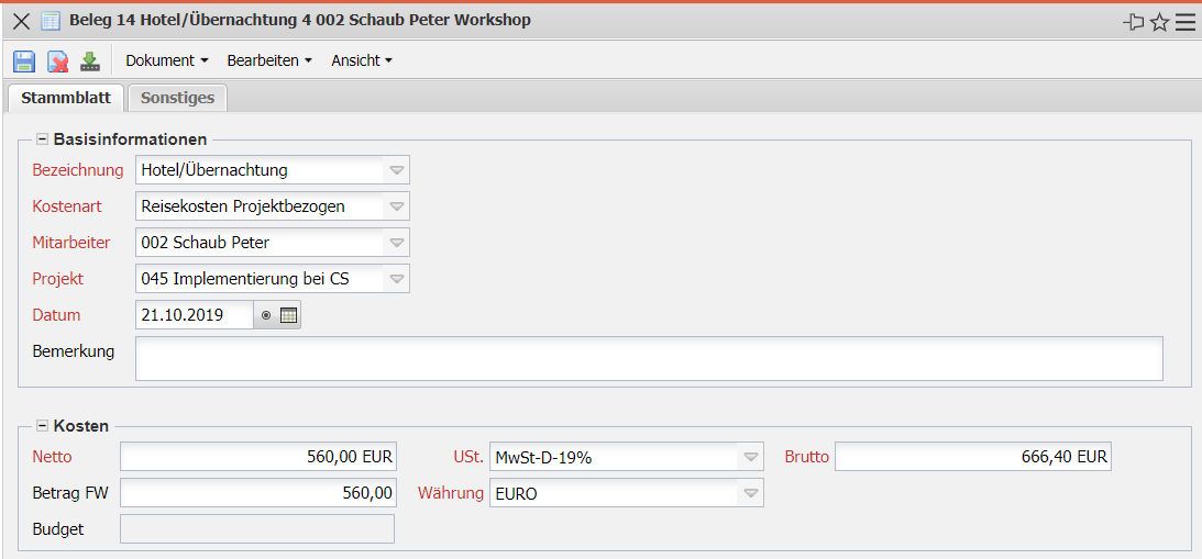 Die Maske Beleg verwaltet alle Belege im System. Grundsätzlich können hier alle Kosten, für die Belege existieren und die ein Mitarbeiter verursacht hat, erfasst und einem Projekt zugeordnet werden. Dazu gehören auch Belege, die inhaltlich zu Reise- und/oder Fahrtkosten zählen. Die Belege können durch Auswahl einer bereits erfassten Reise zugeordnet werden und werden in dem Dokumenttyp Reisen mit ihrer entsprechenden Kostenart angezeigt. Durch Angabe des Netto-Betrages und der Umsatzsteuer wird der Gesamtbetrag errechnet (oder durch Eingabe des Bruttobetrages der entsprechende Nettobetrag). Zusätzlich kann noch die Kostenart und das Belegdatum angegeben werden.