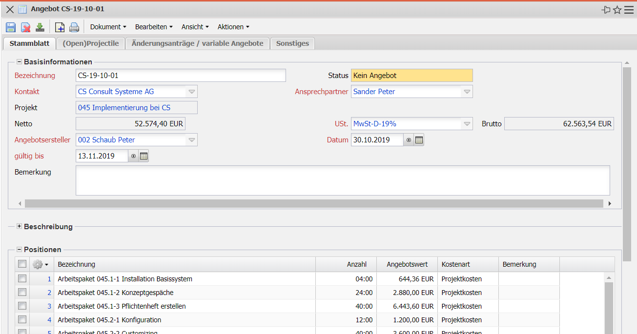 Die Maske Angebot realisiert die Angebotserstellung für ein ausgewähltes Projekt oder Unterprojekt. Ein Angebot kann nur für externe Projekte erstellt werden. Diese Maske beinhaltet die Informationen zum Angebotsbetrag, dem Ersteller des Angebotes, das Angebotsdatum und die zugehörigen Angebotspositionen.