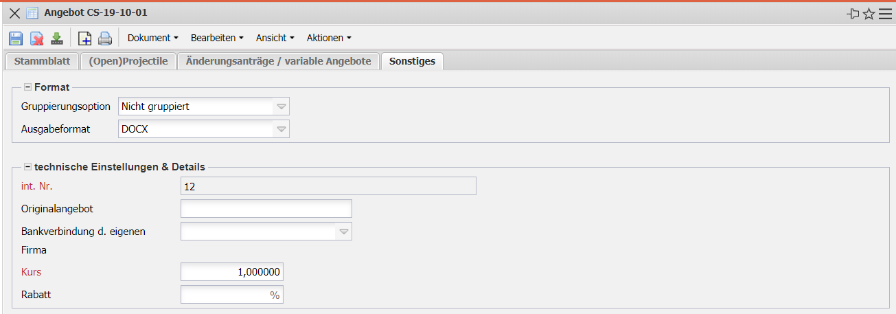 • int. Nr.: In diesem Feld wird die Nummer (INT) des Angebots automatisch vom System hinterlegt.