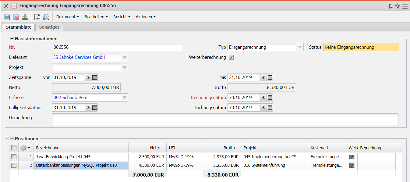 Die Maske Eingangsrechnung verwaltet die Eingangsrechnungen der Partner bzw. Lieferanten für ein bestimmtes Projekt. Die Fremdrechnungen beinhalten Informationen über Lieferant, Status der Rechnung, Leistungsintervall, Nettobetrag, Gesamtbetrag, Ersteller und Datum der Rechnungsstellung.