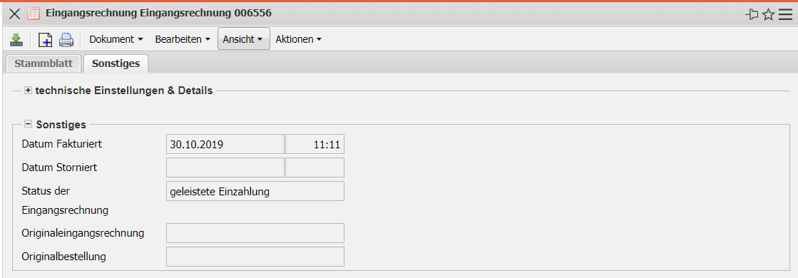 • Datum Storniert: Bei der Stornierung der Eingangsrechnung wird hier das Datum und die Uhrzeit vom System gesetzt.